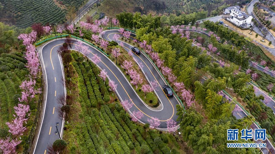 這是3月2日拍攝的平利縣長(zhǎng)安鎮(zhèn)洪福茶山,道路兩旁的春梅盛開(無人機(jī)照片)。新華社記者陶明攝