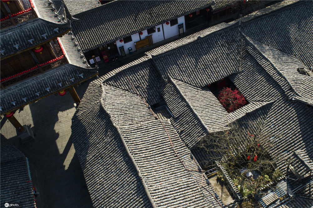 2020年2月21日,四川南充閬中古城中天樓旁,張家小院天井中的海棠在陽光中綻放(無人機拍攝)。