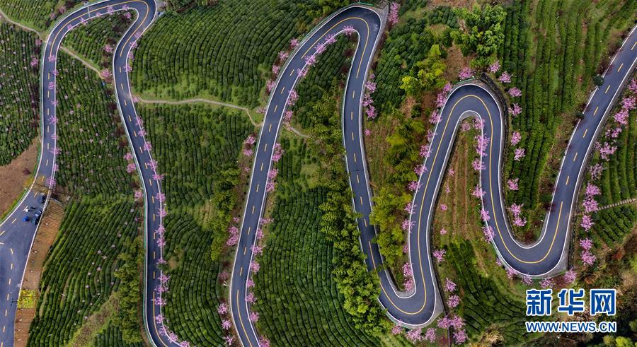 這是3月2日拍攝的平利縣長安鎮(zhèn)洪福茶山,道路兩旁的春梅盛開(無人機照片)。新華社記者陶明攝