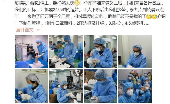 微博上,高鑫寫道:“疫情期間劇組停工,照樣熬大夜。11個(gè)葫蘆娃來做義工啦,我們的目標(biāo),讓機(jī)器24小時(shí)運(yùn)轉(zhuǎn)。工人下班后由我們接替,晚九點(diǎn)到凌晨五點(diǎn)半,一夜做了42000個(gè)口罩,機(jī)械重復(fù)的動作,胳膊已經(jīng)不是我的了。”微博上他還介紹了做口罩的流程,圖文并茂,十分“走心”。