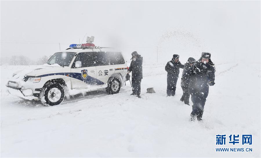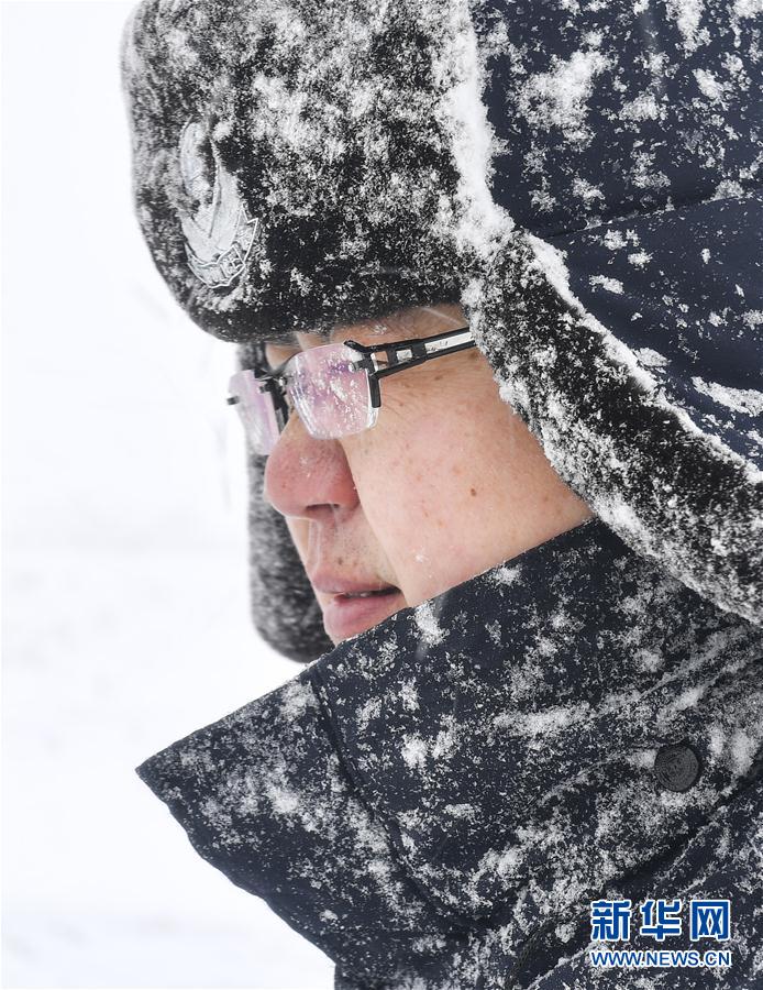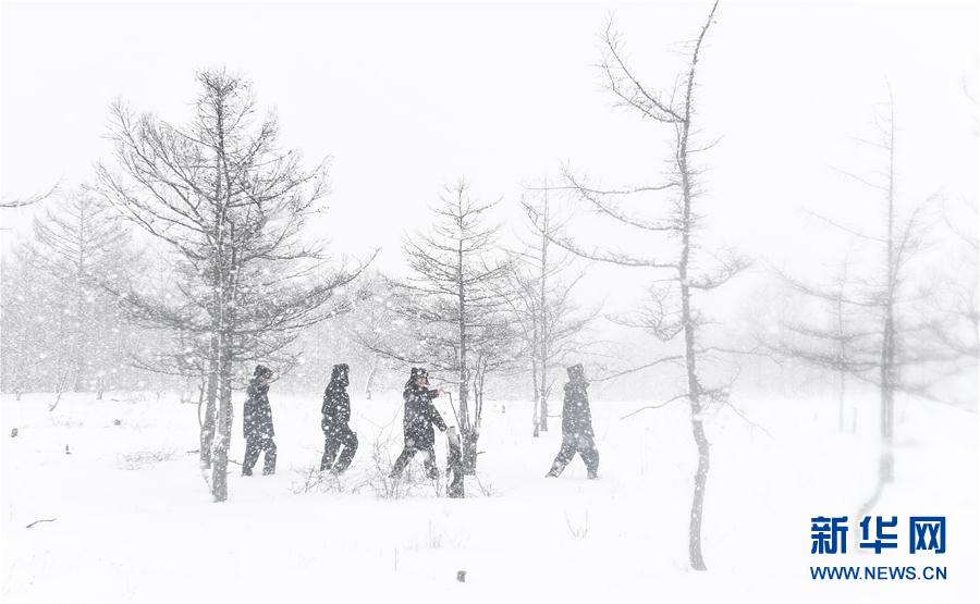 吉林省琿春森林公安局敬信派出所民警在風雪中進行巡護作業(yè)(3月4日攝)。