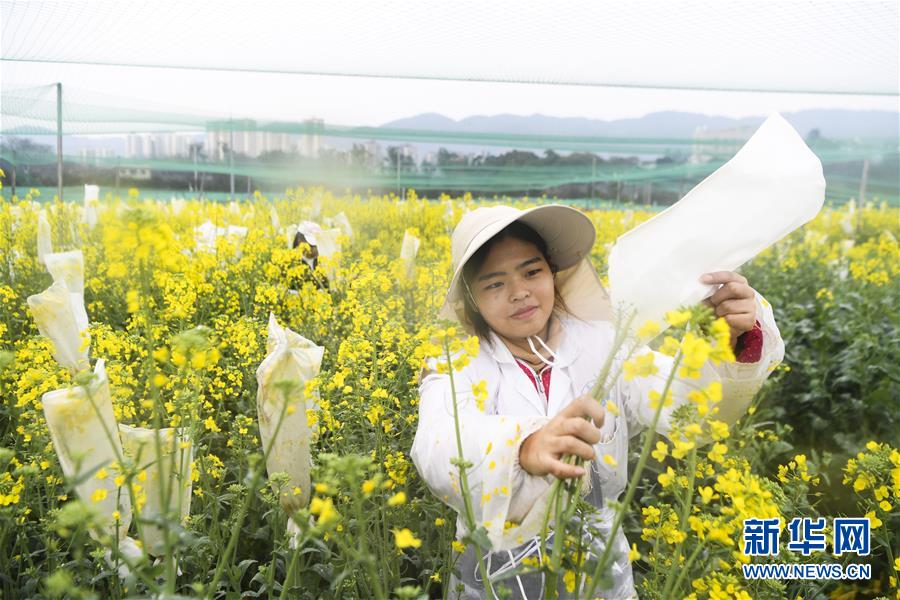 3月5日,工人在重慶市油菜工程技術(shù)研究中心油菜試驗田內(nèi)給油菜花套袋。時下正值油菜花期,重慶市油菜工程技術(shù)研究中心的農(nóng)學專家?guī)ьI學生和技術(shù)工人搶抓農(nóng)時,推進油菜科研和育種工作。新華社記者 王全超 攝