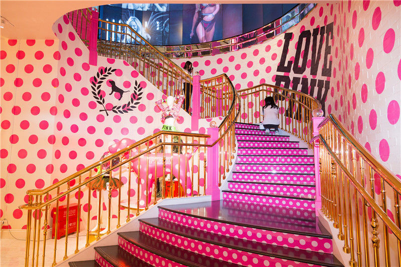 2018年5月17日,北京王府井維密旗艦店。店內(nèi)旋梯很漂亮,上下一共3層,1、2層巨大的環(huán)形電視墻,播放著維密超模走秀的視頻,地下一層粉嫩的風格粉嫩,充滿了少女心。劉鋒/千龍圖像/視覺中國