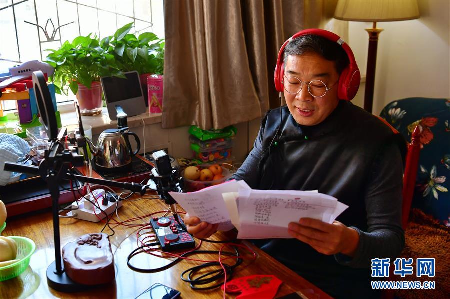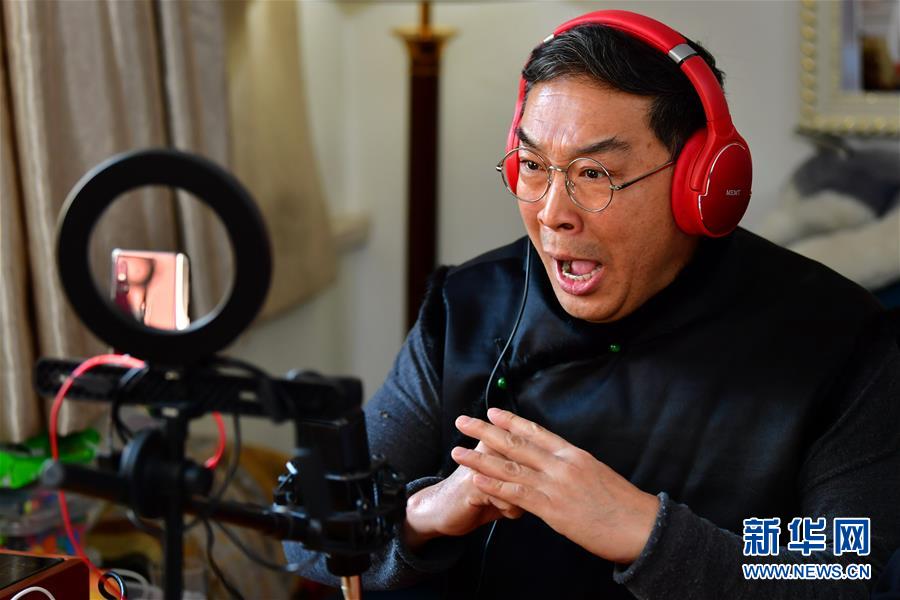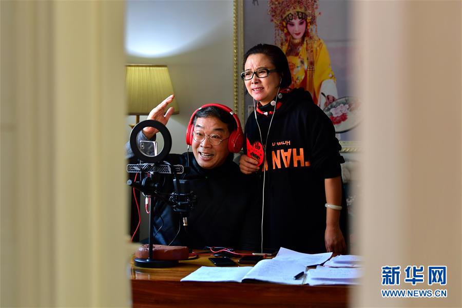 武凌云、王春梅夫妻在直播中表演晉劇片段(3月5日攝)。 新華社記者 曹陽 攝