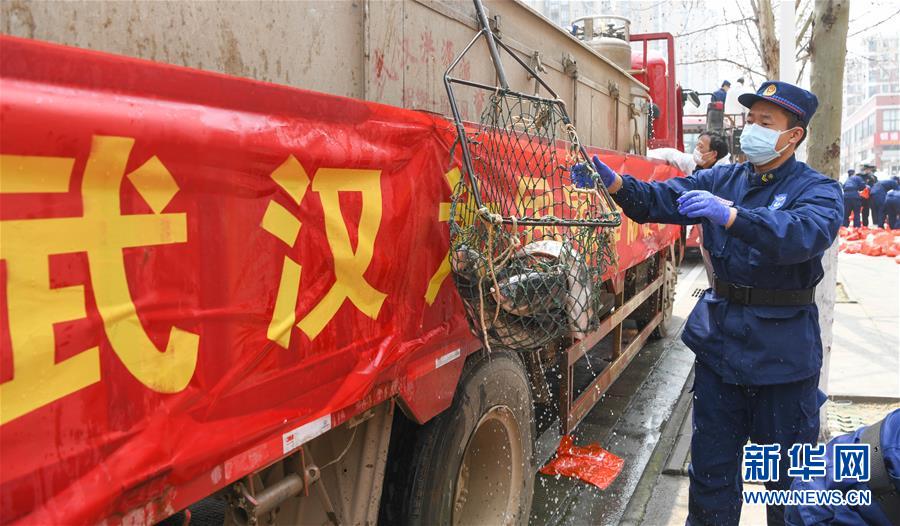 3月13日,一批運到武漢市硚口區(qū)華生漢口城市廣場社區(qū)的活魚正在卸貨。當日,首批100噸調(diào)配自湖北省咸寧市的活魚運抵武漢市硚口區(qū)11個街道下轄社區(qū)。咸寧是魚米之鄉(xiāng),水產(chǎn)資源豐富。此次戰(zhàn)疫咸寧得到了全國人民的支持,疫情得到良好控制。咸寧送魚,希望傳遞愛心,支持武漢早日戰(zhàn)勝疫情。新華社記者程敏攝