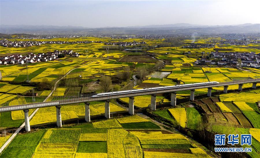 3月14日,一列動(dòng)車從洋縣油菜花海中駛過(guò)(無(wú)人機(jī)照片)。近日,秦嶺南麓的陜西省漢中市洋縣14萬(wàn)畝油菜花競(jìng)相開放,美景如畫。新華社記者陶明攝