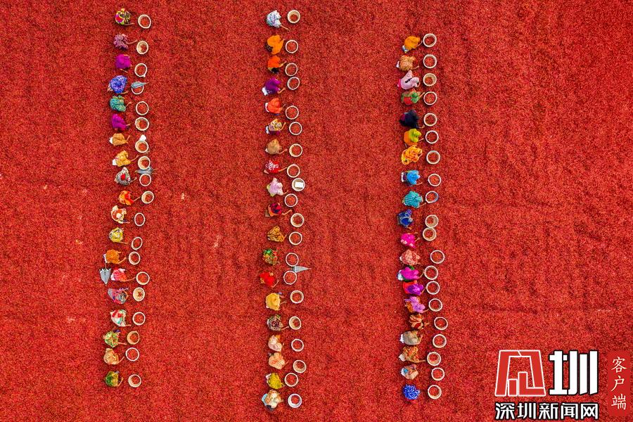 航拍孟加拉國工人分揀辣椒 滿眼火紅大地如鋪上地毯
