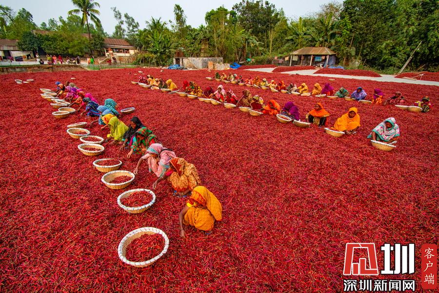 航拍孟加拉國(guó)工人分揀辣椒 滿眼火紅大地如鋪上地毯