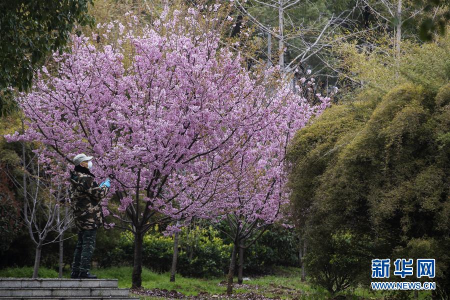 3月3日,一名工作人員在觀賞盛開的櫻花。新華社記者費(fèi)茂華攝