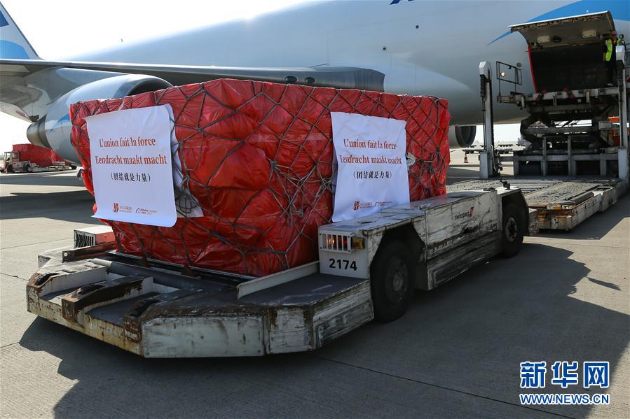 來自中國的30萬只口罩當(dāng)?shù)貢r間16日中午運抵比利時列日機場。 新華社記者 張鋮 攝