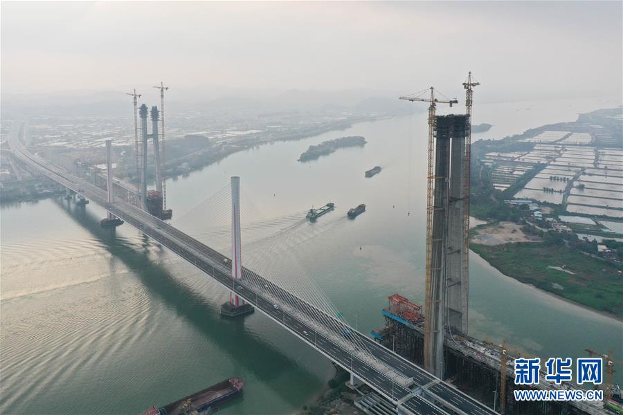 廣州南沙港鐵路跨西江斜拉橋主塔封頂