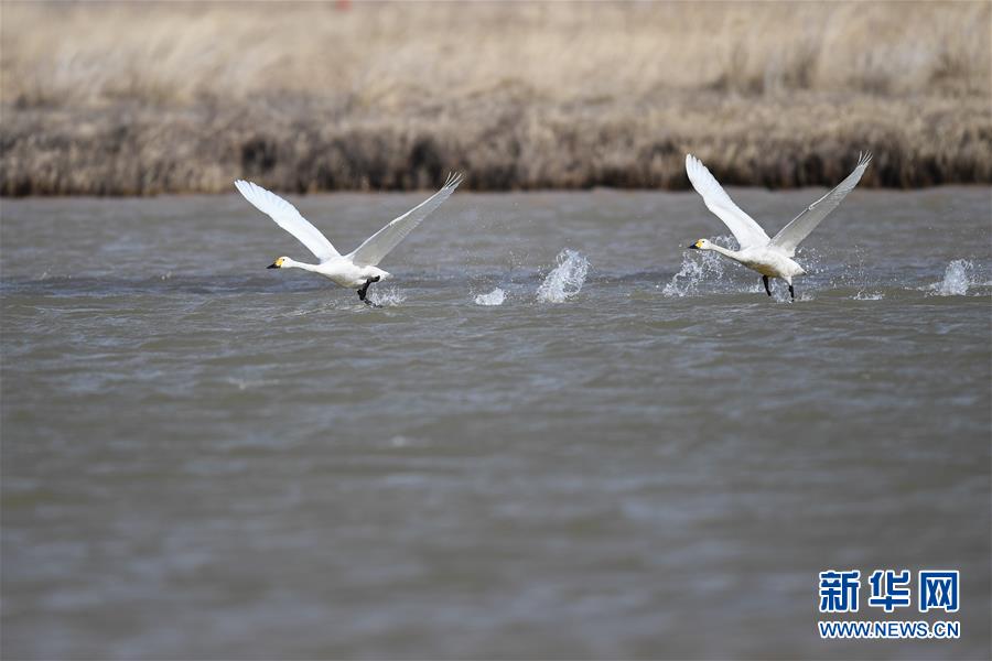3月18日,候鳥(niǎo)在準(zhǔn)格爾旗大路鎮(zhèn)的黃河淺灘上起飛。 新華社記者 于嘉 攝