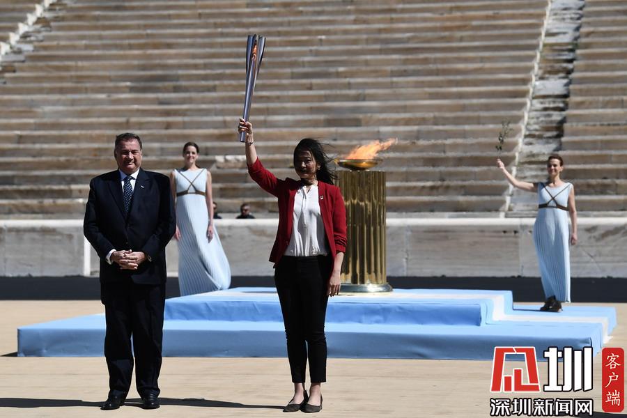 3月19日,日本代表團(tuán)成員井本直步子(右)從希臘奧委會(huì)主席斯皮羅斯·卡普拉洛斯手中接過東京奧運(yùn)會(huì)圣火火炬。