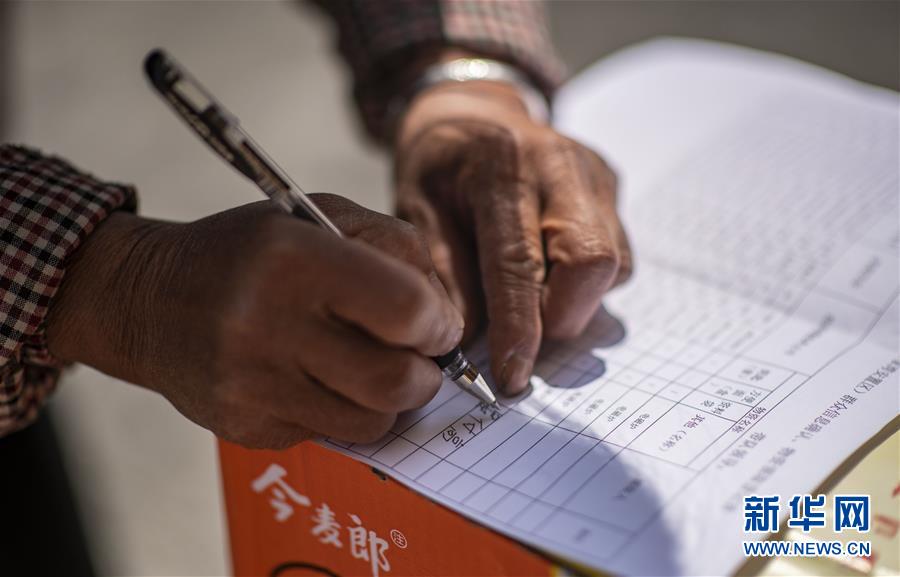 抵達魯?shù)榭h卯家灣易地扶貧安置區(qū)的王大香在領(lǐng)取新家鑰匙的名冊上簽下丈夫的名字(3月15日攝)。 新華社記者 江文耀 攝