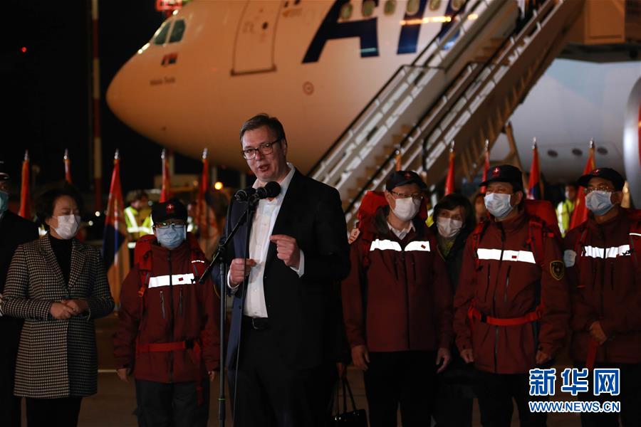 3月21日,在塞爾維亞首都貝爾格萊德,塞爾維亞總統(tǒng)武契奇在歡迎中國(guó)援助塞爾維亞抗疫醫(yī)療專家組的儀式上致辭。 中國(guó)援助塞爾維亞抗疫醫(yī)療專家組一行6人21日晚乘專機(jī)抵達(dá)塞首都貝爾格萊德,由中國(guó)政府捐贈(zèng)的一批醫(yī)療物資同機(jī)抵達(dá)。 新華社記者 石中玉 攝