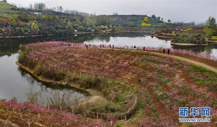 3月22日,游人在柳山湖的桃花島上游覽(無人機(jī)照片)。陽春三月,陜西省漢中市洋縣龍亭鎮(zhèn)柳山村,1300畝桃園的花朵綻放。新華社記者陶明攝