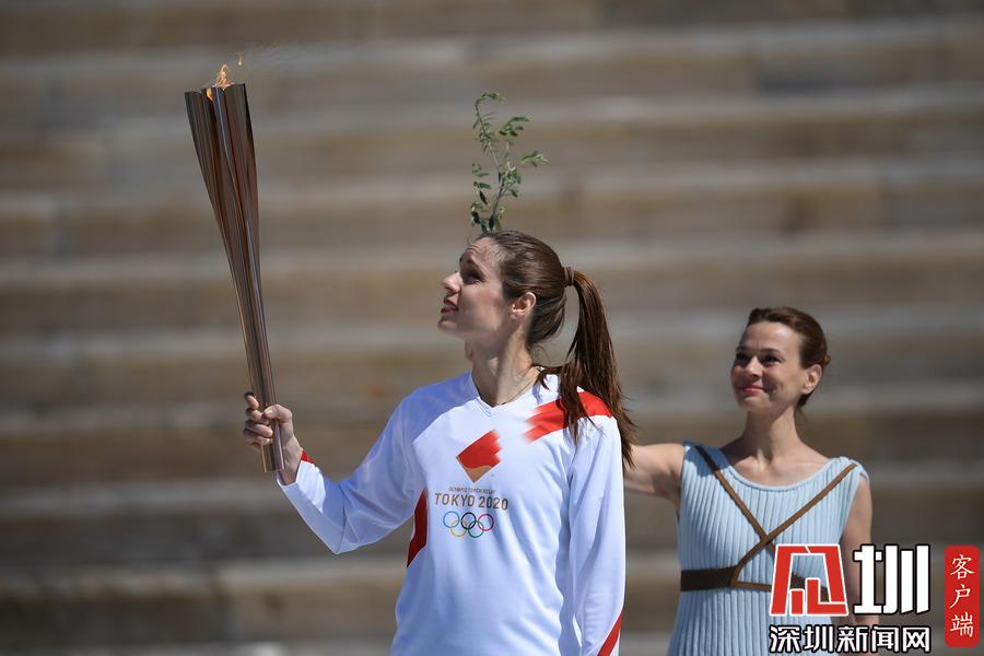 3月19日,最后一名火炬手里約奧運(yùn)會(huì)女子撐桿跳高冠軍、希臘運(yùn)動(dòng)員卡特琳娜·斯特凡尼季手持圣火火炬跑向終點(diǎn)。