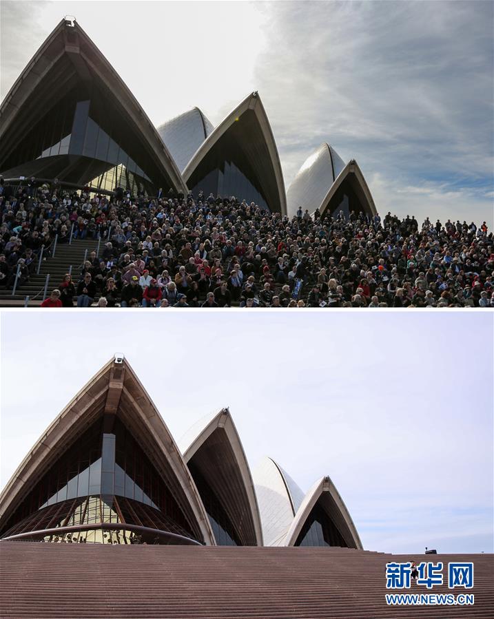 拼版照片顯示:(上)2019年6月14日,大量市民坐在澳大利亞悉尼歌劇院前的臺階上。(下)2020年3月24日,澳大利亞悉尼歌劇院前的臺階上空空蕩蕩。澳大利亞從當(dāng)?shù)貢r(shí)間3月23日中午起,關(guān)閉影院、室內(nèi)體育館、健身房等文體娛樂場所,飯店和咖啡館只允許外賣業(yè)務(wù)。 新華社記者 白雪飛 攝