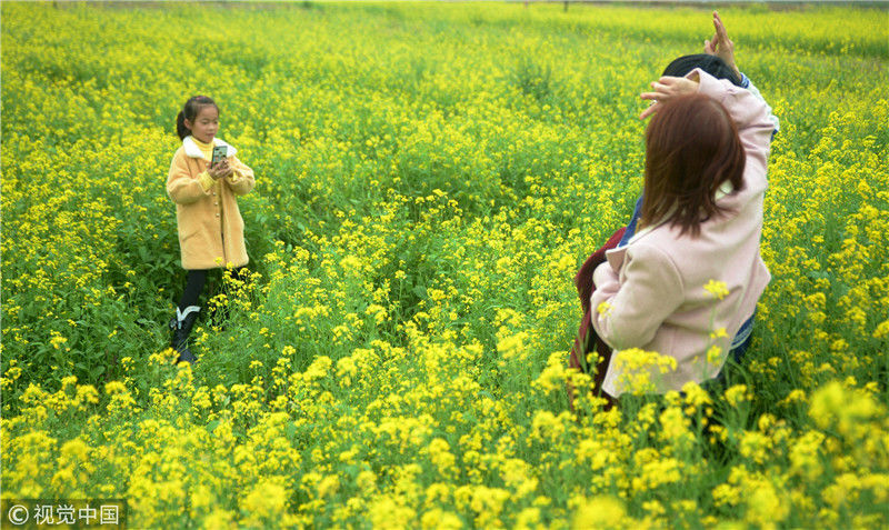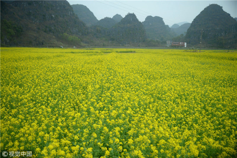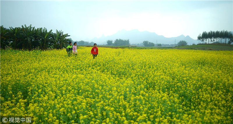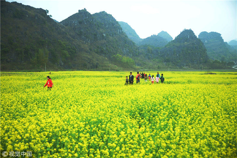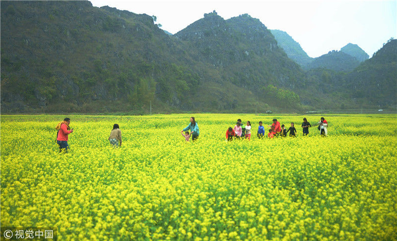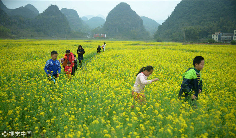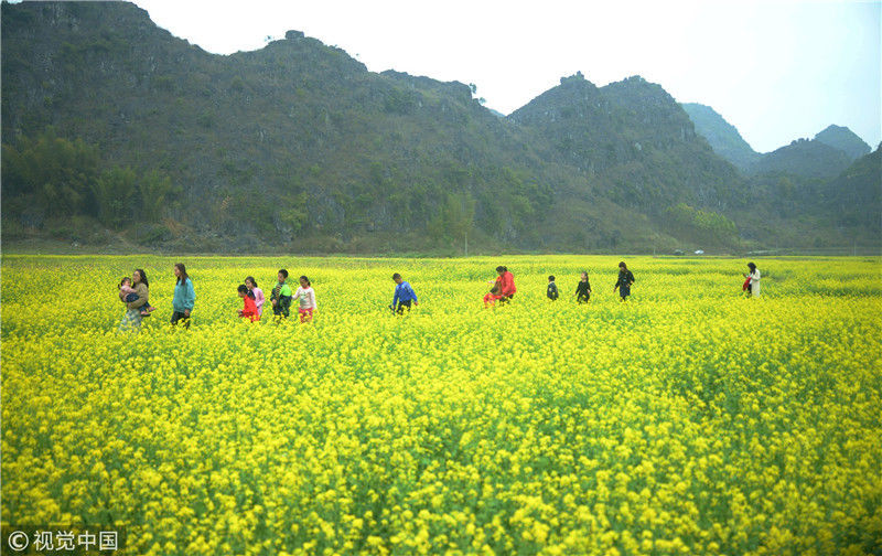 2019年2月5日,春節(jié)期間,廣西來賓市忻城縣萬余畝油菜花競相綻放,吸引眾多游客前來賞花游玩,感受春天的氣息。近年來,廣西忻城縣大力實施鄉(xiāng)村振興戰(zhàn)略,注重發(fā)展鄉(xiāng)村旅游產(chǎn)業(yè),把鄉(xiāng)村旅游與美麗鄉(xiāng)村、脫貧攻堅緊密結(jié)合起來,輻射帶動當(dāng)?shù)刎毨裘撠氈赂?。樊紹光/視覺中國