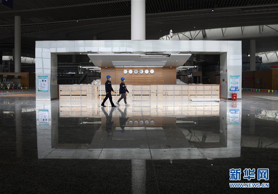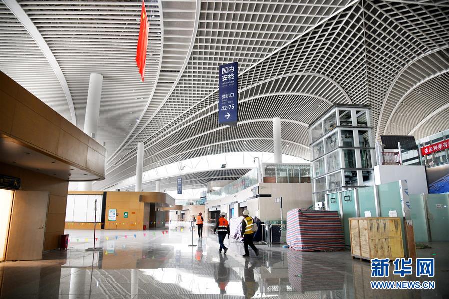 3月25日,幾名工人從建設(shè)中的青島膠東國(guó)際機(jī)場(chǎng)航站樓出發(fā)大廳走過(guò)。新華社記者李紫恒攝