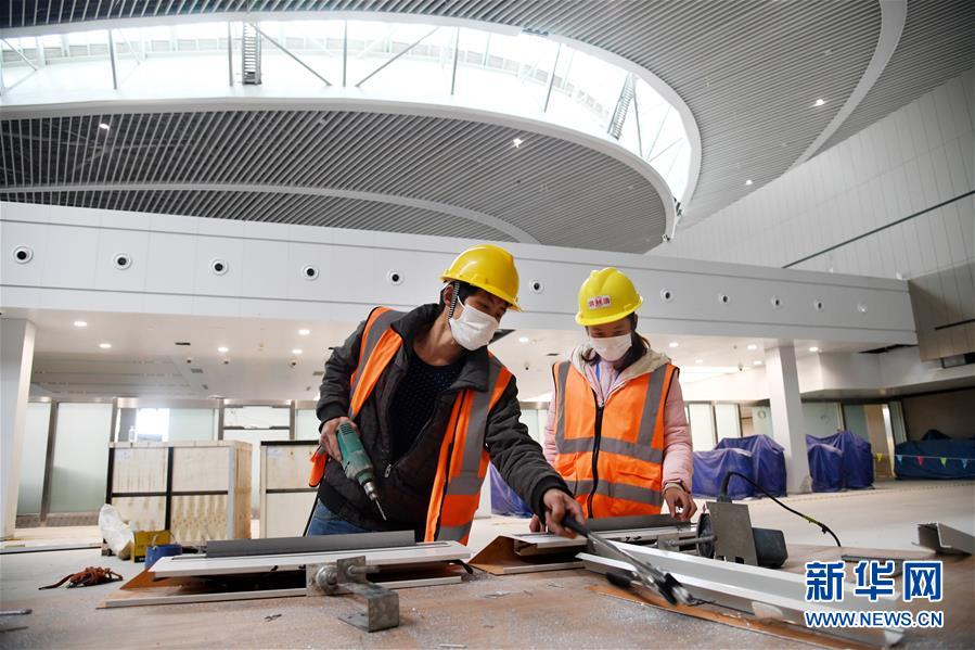 3月25日,兩名工人在青島膠東國(guó)際機(jī)場(chǎng)航站樓中央景觀區(qū)施工。新華社記者李紫恒攝
