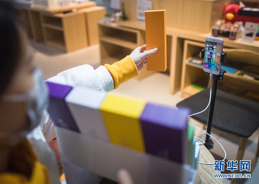 3月29日,在漢口北市場(chǎng),一名主播在直播平臺(tái)直播銷(xiāo)售一款鋼筆。新華社記者肖藝九攝