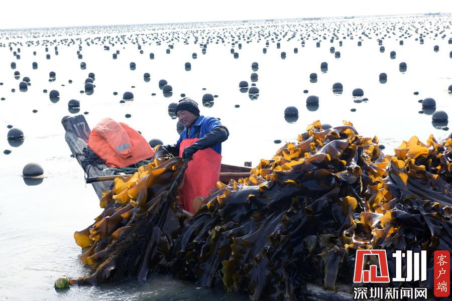 2020年3月29日,山東威海,榮成市愛連灣海水養(yǎng)殖區(qū)域,養(yǎng)殖工人開始收割海帶。