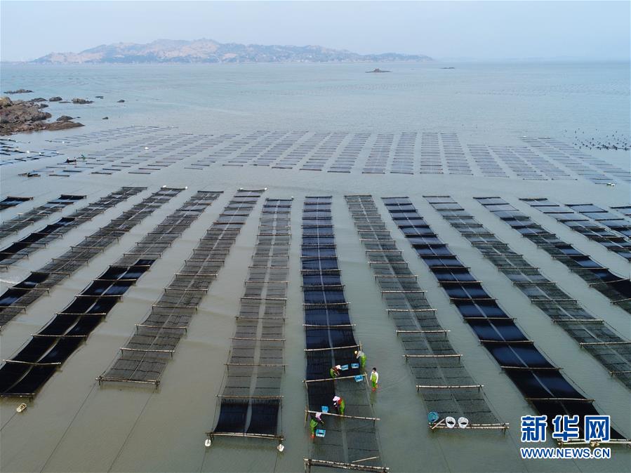 10月24日,福建莆田蔣山村村民在海上收割紫菜(無人機(jī)拍攝)。 新華社記者姜克紅攝