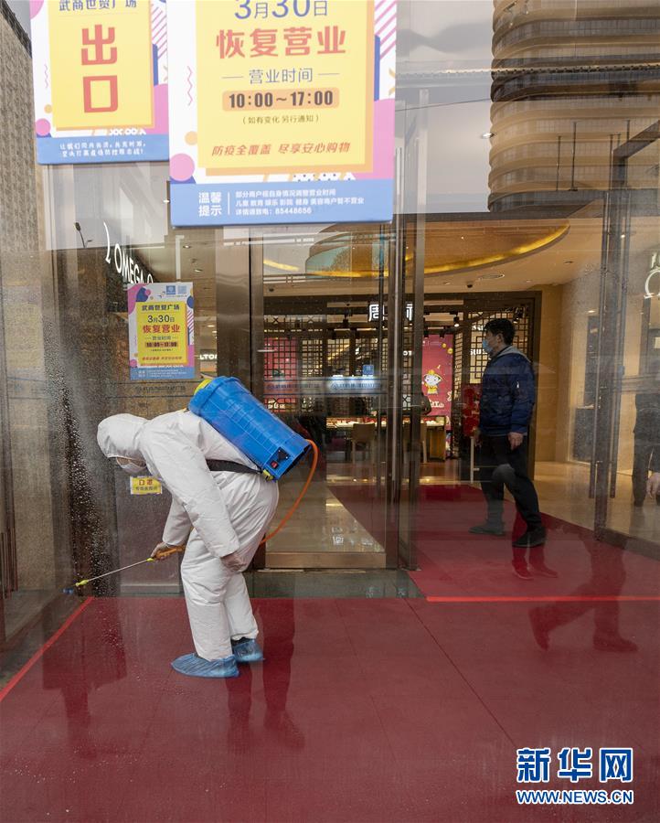 3月30日,在武商世貿(mào)廣場,工作人員在開門前進(jìn)行最后的消殺工作。當(dāng)日,武漢市多家商場開門迎客。新華社記者費茂華攝