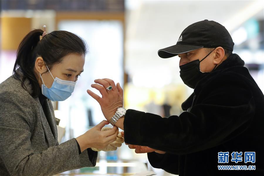 3月30日,在武漢市武商世貿(mào)廣場(chǎng),一名顧客(右)在挑選手表。當(dāng)日,武漢市多家商場(chǎng)開(kāi)門迎客。新華社記者沈伯韓攝