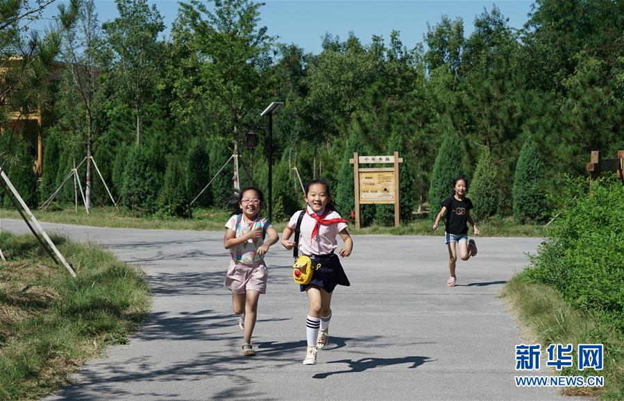 小學生們在千年秀林內玩耍(8月29日攝)。新華社記者牟宇攝
