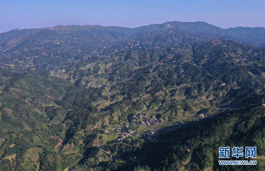 這是融水苗族自治縣桿洞鄉(xiāng)小河村高羽苗寨的木樓和梯田(3月31日攝,無人機照片)。新華社記者黃孝邦攝