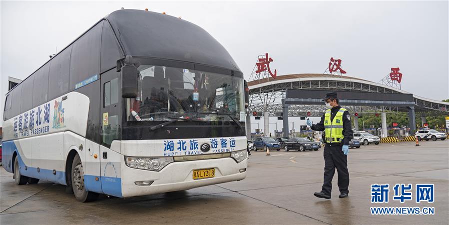 3月24日,在武漢西高速收費(fèi)站交通卡點(diǎn),執(zhí)勤民警陳鋼示意載有復(fù)工復(fù)產(chǎn)人員的大巴通行。新華社記者才揚(yáng)攝