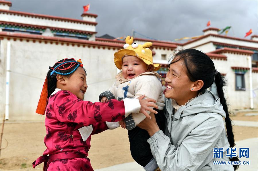 在拉薩市堆龍德慶區(qū)古榮鄉(xiāng)榮瑪高海拔生態(tài)搬遷點,石珍(右)和女兒格桑曲達(左)、兒子嘎瑪曲英在家門口玩耍(4月1日攝)。石珍是榮瑪高海拔生態(tài)搬遷點醫(yī)務室的村醫(yī),這份工作每月為她帶來2590元收入。新華社記者 詹彥 攝