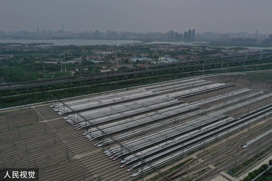 2020年4月6日,武漢動(dòng)車段高鐵動(dòng)車組整裝待發(fā)(無人機(jī)照片)。