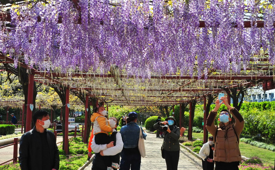 2020年4月5日,上海,每年的4月上旬至5月初是觀賞紫藤花的最佳時(shí)期。清明小長假里,晴好天氣使嘉定紫藤園迎來了不少市民游客。今年的紫藤公園采取提前預(yù)約和亮相綠色隨申碼的舉措入園賞花。公園擁有26個(gè)品種的紫藤花,盛開時(shí)期的紫藤花穗最長可達(dá)1米多。花色有紫,粉,白等,形成的花瀑宛若一簾幽夢(mèng),雅致春意今人流連忘返。