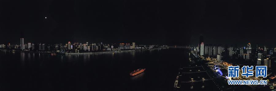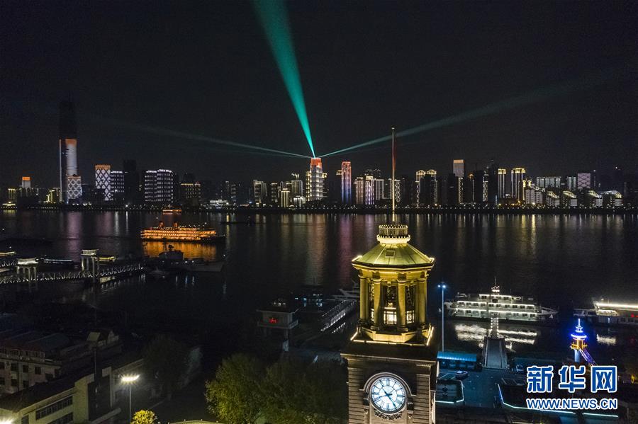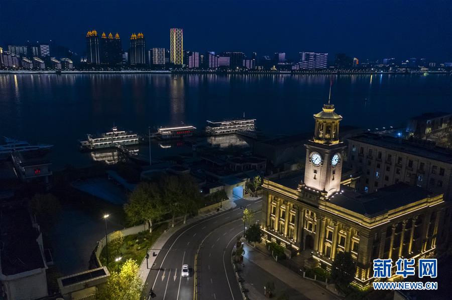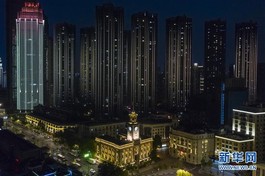 這是4月7日晚拍攝的武漢市江漢關(guān)博物館附近的長江兩岸建筑燈光夜景(無人機(jī)拍攝)。4月8日零時(shí)起,武漢市正式解除離漢離鄂通道管控措施。新華社記者沈伯韓攝