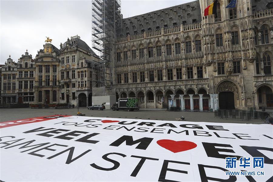 這是4月13日在比利時布魯塞爾大廣場拍攝的為抗擊疫情加油的巨幅海報。當日,比利時布魯塞爾市政府工作人員在市中心的大廣場展開一面巨幅海報,上面用法語和荷蘭語印著“一起鼓起勇氣”“謝謝”,以感謝市民及醫(yī)療人員為抗擊疫情所做的努力。新華社記者鄭煥松攝