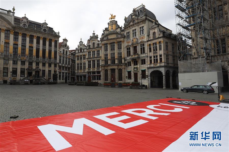 這是4月13日在比利時布魯塞爾大廣場拍攝的為抗擊疫情加油的巨幅海報。當(dāng)日,比利時布魯塞爾市政府工作人員在市中心的大廣場展開一面巨幅海報,上面用法語和荷蘭語印著“一起鼓起勇氣”“謝謝”,以感謝市民及醫(yī)療人員為抗擊疫情所做的努力。新華社記者鄭煥松攝