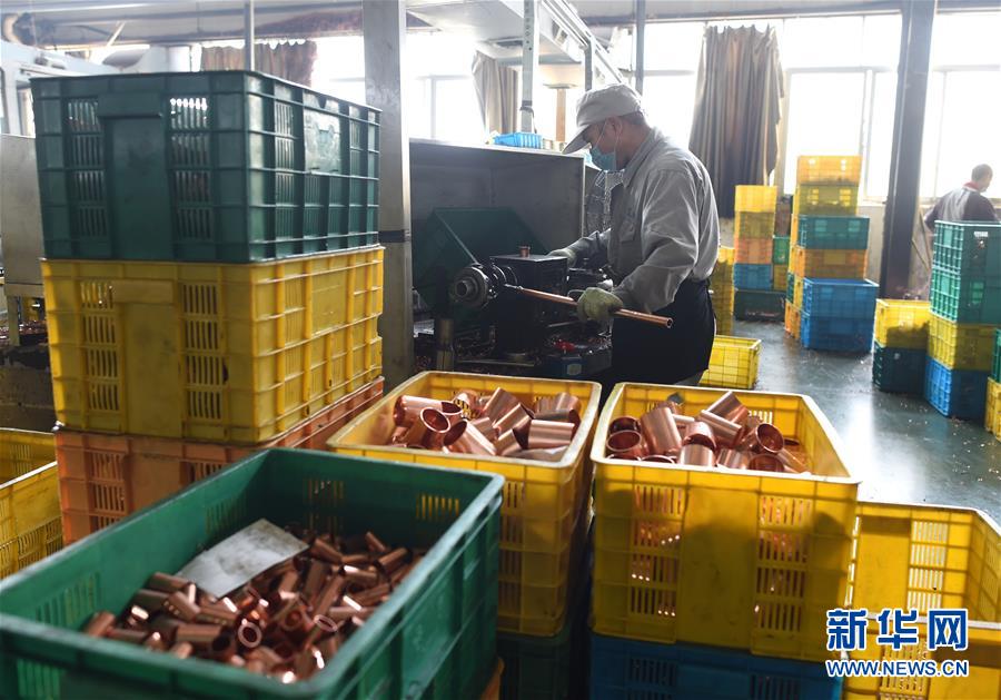 4月13日,員工在位于店口鎮(zhèn)的諸暨市浩海空調(diào)器制造有限公司車間內(nèi)生產(chǎn)銅管件。新華社記者韓傳號攝