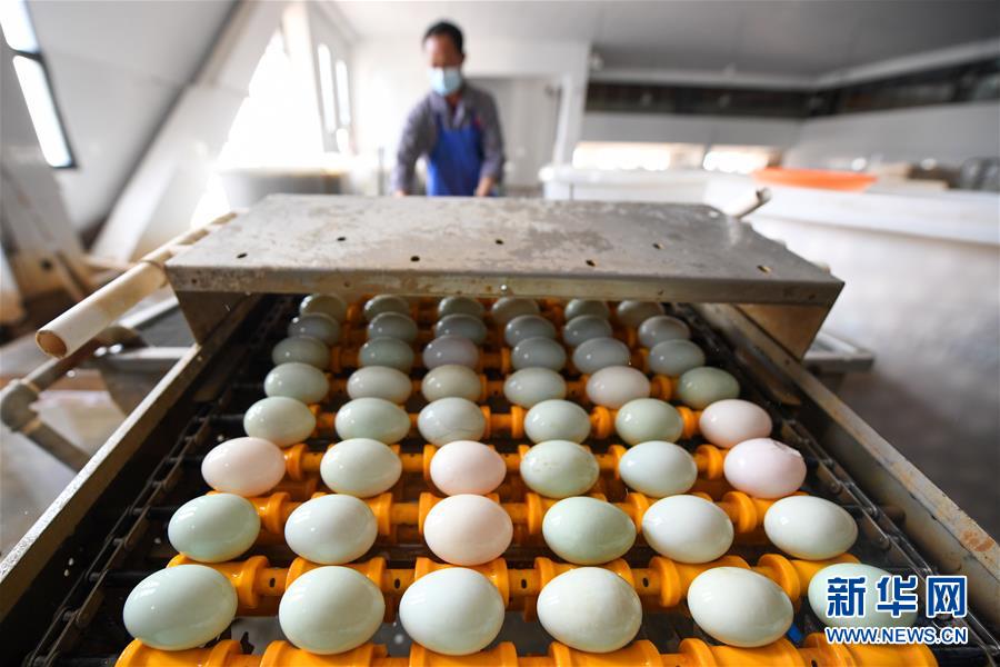 江蘇高郵鴨集團(tuán)的工作人員將腌制好的鴨蛋放到塑封包裝流水線上(4月15日攝)?!案哙]鴨蛋”是江蘇高郵的特色農(nóng)業(yè)名片。近年來(lái),當(dāng)?shù)卦诹挤N繁育、生態(tài)養(yǎng)殖、產(chǎn)品加工等方面加大力度,推動(dòng)高郵鴨蛋品牌化建設(shè),讓小鴨蛋成為帶動(dòng)農(nóng)戶致富的大產(chǎn)業(yè)。2019年,高郵市共計(jì)生產(chǎn)熟制鴨蛋產(chǎn)品近11.2億枚,年產(chǎn)值近17.68億元。新華社記者李博攝