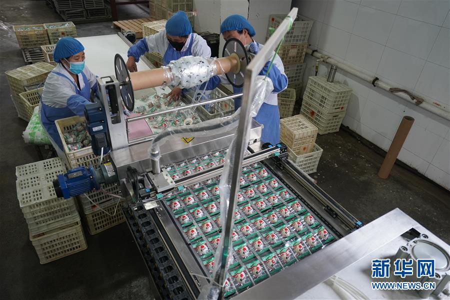 4月15日,在江蘇高郵鴨集團(tuán)生產(chǎn)車間,工人整理塑封包裝好的咸鴨蛋?!案哙]鴨蛋”是江蘇高郵的特色農(nóng)業(yè)名片。近年來(lái),當(dāng)?shù)卦诹挤N繁育、生態(tài)養(yǎng)殖、產(chǎn)品加工等方面加大力度,推動(dòng)高郵鴨蛋品牌化建設(shè),讓小鴨蛋成為帶動(dòng)農(nóng)戶致富的大產(chǎn)業(yè)。2019年,高郵市共計(jì)生產(chǎn)熟制鴨蛋產(chǎn)品近11.2億枚,年產(chǎn)值近17.68億元。新華社記者季春鵬攝
