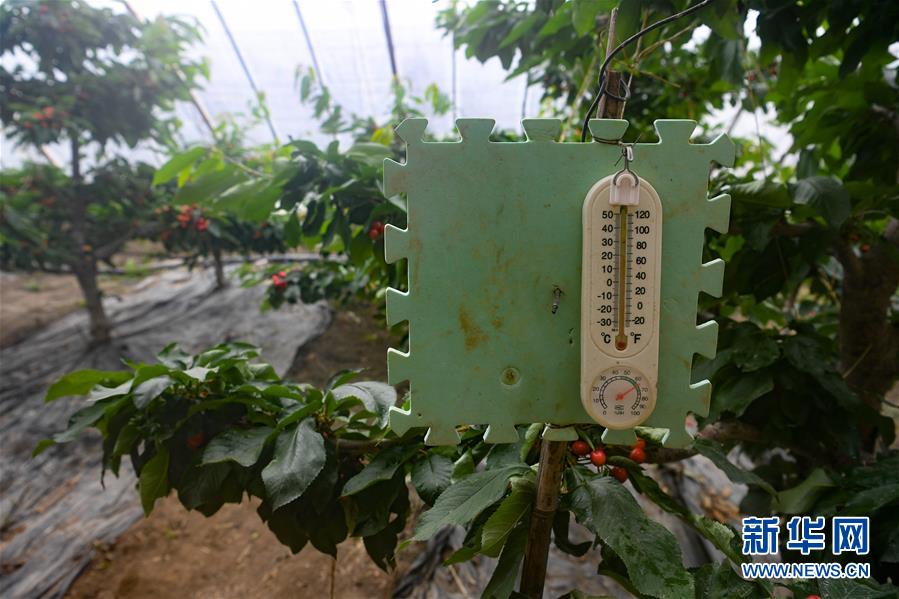 這是4月15日在特克斯礪劍鋒農(nóng)林科技有限公司赤谷新城休閑觀光農(nóng)業(yè)示范園拍攝的反季節(jié)大櫻桃大棚內(nèi)的溫濕度計。大棚采用自動控制通風(fēng)裝置,保持棚內(nèi)溫度濕度穩(wěn)定。近日,新疆伊犁哈薩克自治州特克斯縣的反季節(jié)大櫻桃陸續(xù)上市。傳統(tǒng)大田櫻桃的集中成熟期在6月底至7月初,采用溫室大棚種植櫻桃可將成熟期提前到3月底至4月初,填補了市場空檔期。特克斯礪劍鋒農(nóng)林科技有限公司目前種植反季節(jié)大櫻桃共有19棚,櫻桃每公斤售價達(dá)200元。新華社記者宋彥樺攝