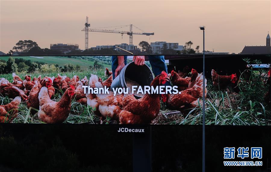 4月15日,在澳大利亞悉尼,戶外廣告牌上打出“感謝農(nóng)場工作者”的字樣,感謝在疫情期間工作的人們。新華社記者白雪飛攝