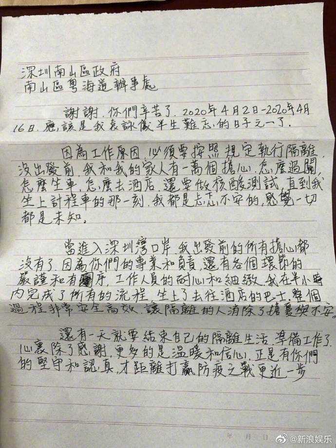 她在信中說,出發(fā)前,她和家人十分擔(dān)心,不知如何過關(guān)、坐車、去酒店,但進入深圳灣口岸后,她所有的擔(dān)心都沒有了,因為有了大家的專業(yè)和負責(zé),各個環(huán)節(jié)的嚴謹和有序,工作人員的耐心和細致,她在半小時內(nèi)就完成所有流程,坐上了去酒店的巴士。信里,袁詠儀對政府工作人員表示了感謝,“就像星星,我無法始終看見他們,但是我知道他們永遠在那里?!?/p>