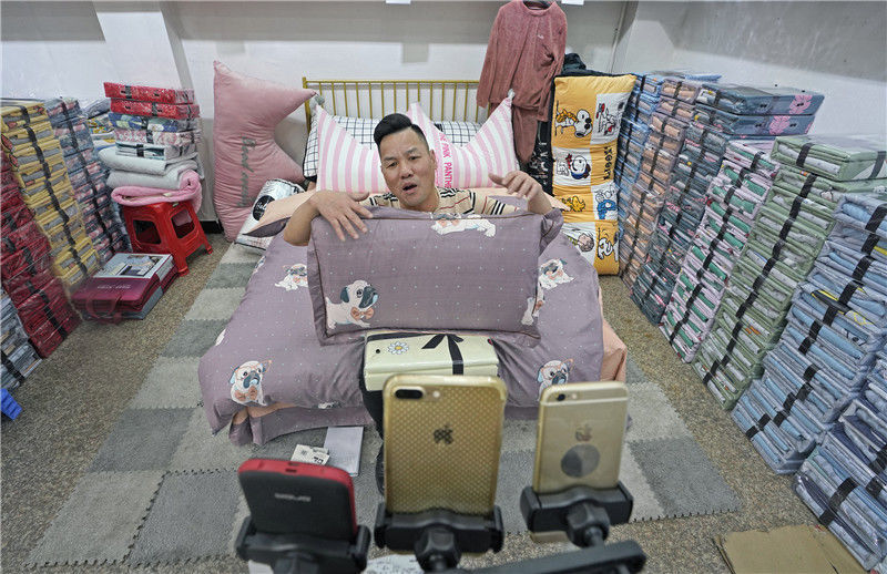 2019年11月11日,浙江金華,義烏北下朱村,在一家床上用品銷售商店,一名男子正在直播。這個網名叫“點子大哥”的男子姓劉,49歲,來自杭州農村,有三年半的直播經歷。