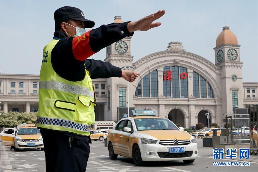 4月8日,管理人員在漢口火車站前指揮出租汽車入位。新華社記者王毓國攝