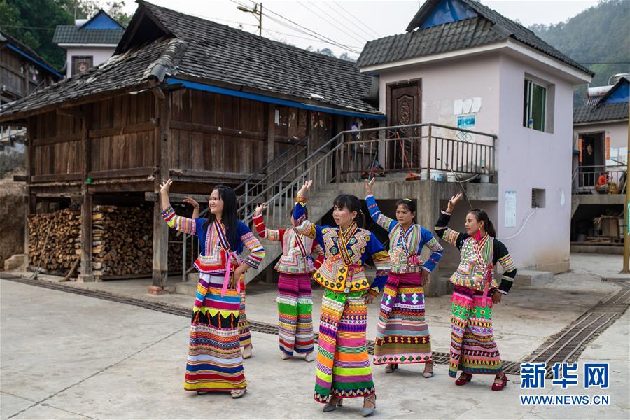 4月10日,在云南省勐海縣布朗山鄉(xiāng)曼囡村曼班三隊(duì),娜四(中)和村民一起跳舞。新華社記者胡超攝