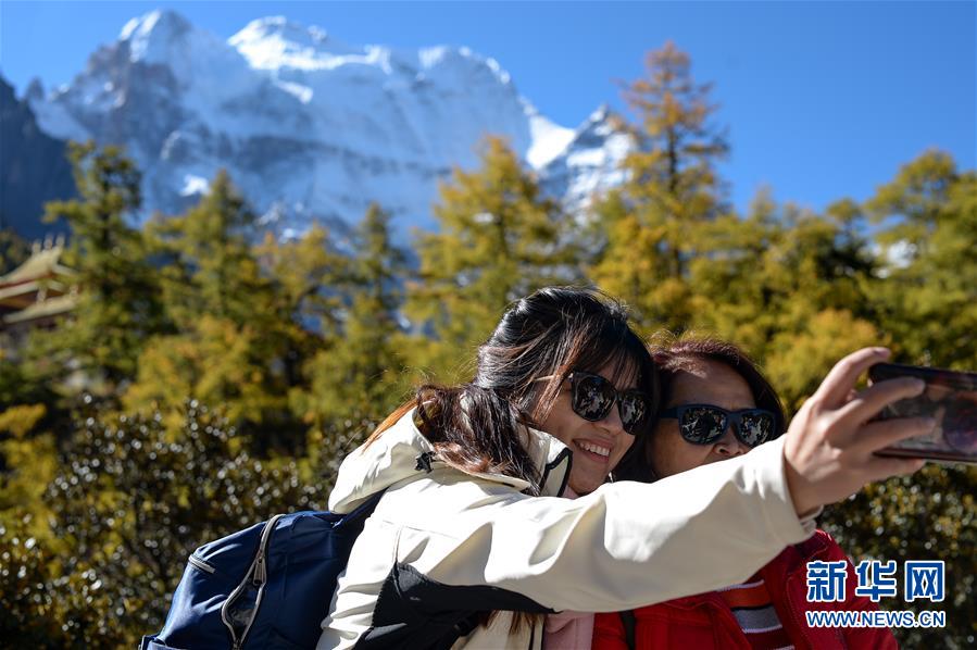 游客在亞丁景區(qū)內(nèi)拍照合影(2019年10月20日攝)。新華社記者唐文豪攝