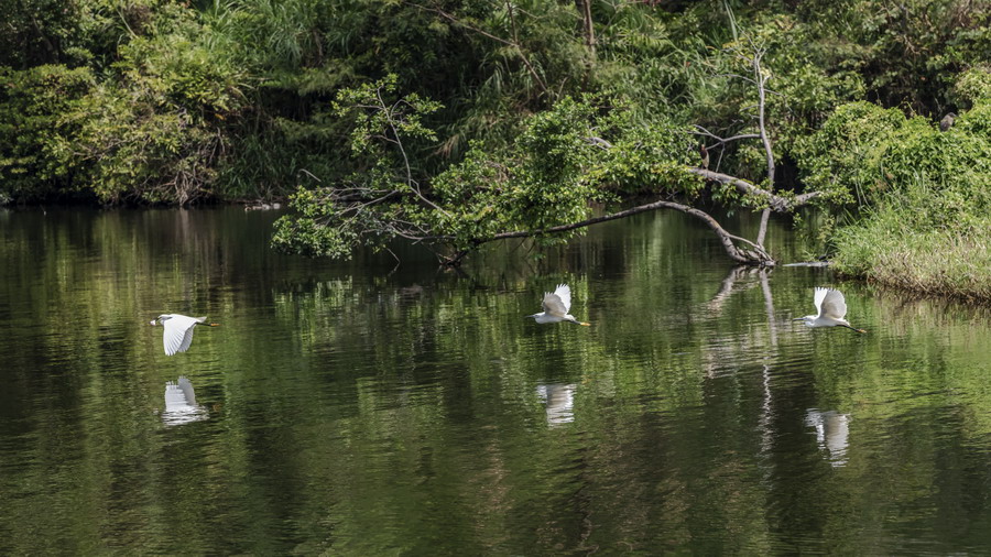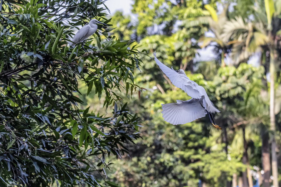 4月15日,攝于南山區(qū)華僑城天鵝堡附近。這是深圳拍鷺鳥的其中一個(gè)好去處。左一白鷺捕到食物,后方兩只白鷺追趕。徐捷攝